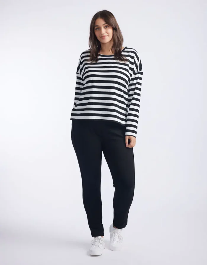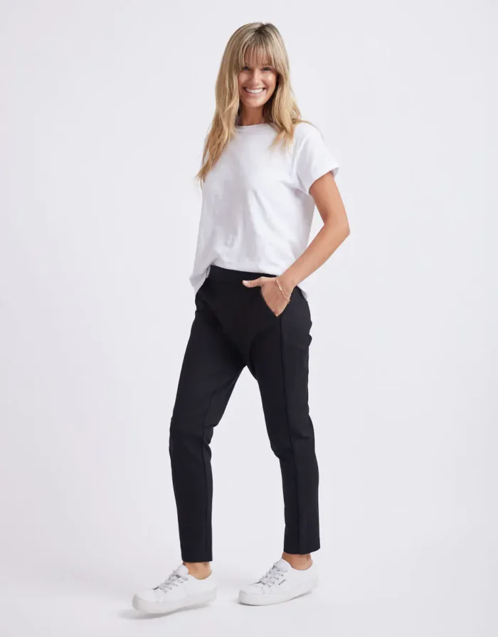 Just like everyone has their go-to little black dress, the Little Black Ponti Pants from are the equivalent wardrobe essential. These chic black pants are a versatile must-have, boasting a slim fit that tapers towards the ankle for a flattering look. The subtle black piping detail down the side of the leg adds a touch of casual flair, perfect for transitioning from a relaxed day out to an evening gathering with ease. The elastic waistband ensures comfort, while the smooth ponti fabric provides a structured yet stretchy feel, allowing you to move freely throughout your day.